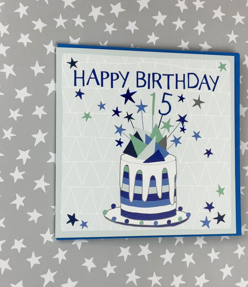 15th Birthday Boy. Foiled with silver. Supplied with a blue envelope.