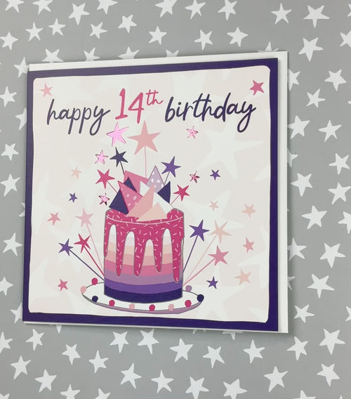 14th Birthday Girl. Foiled with silver. Supplied with a white envelope.