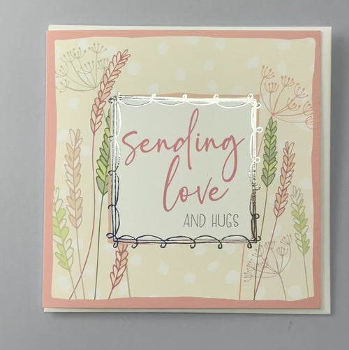 Sending Love and Hugs. Foiled with silver. Supplied with a white envelope.