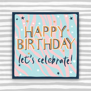 Happy Birthday - let's celebrate! Greeting card. Foiled and supplied with a coloured envelope.