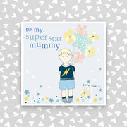 Superstar Mummy - Little boy with balloons. Printed on luxury board, foiled and embossed.
