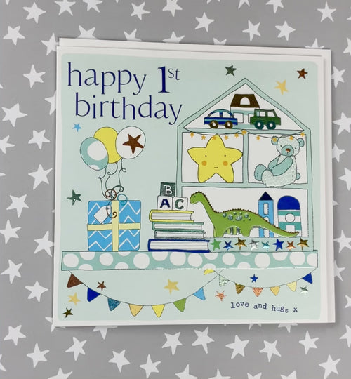 Happy 1st Birthday - Blue. Foiled and embossed. Supplied with an envelope.