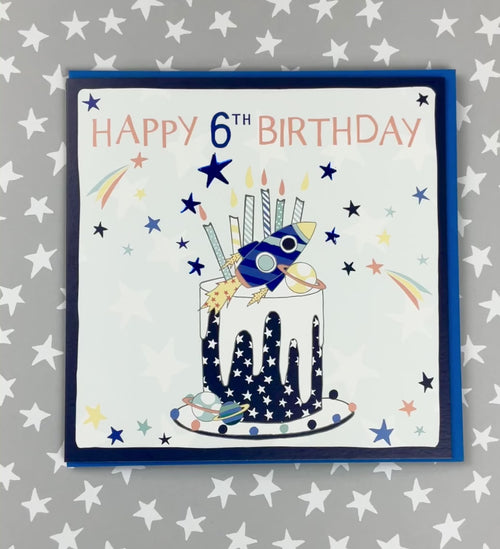 6th Birthday Boy. Foiled with silver. Supplied with a blue envelope.