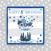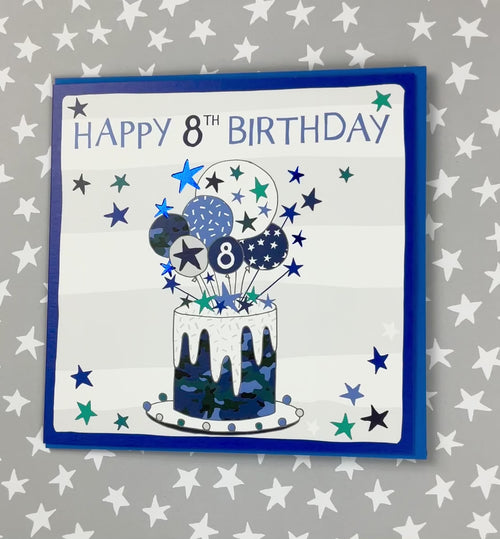 8th Birthday Boy. Foiled with silver. Supplied with a blue envelope.