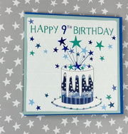 9th Birthday Boy. Foiled with silver. Supplied with a blue envelope.