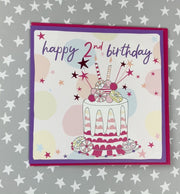 2nd Birthday Girl. Foiled with silver. Supplied with a pink envelope.