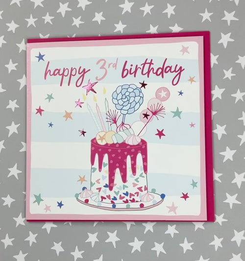 3rd Birthday Girl. Foiled with silver. Supplied with a pink envelope.